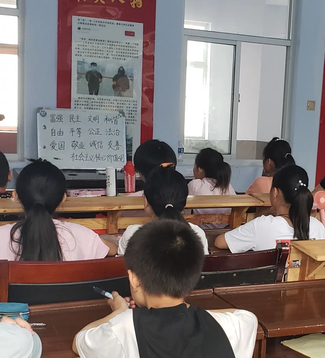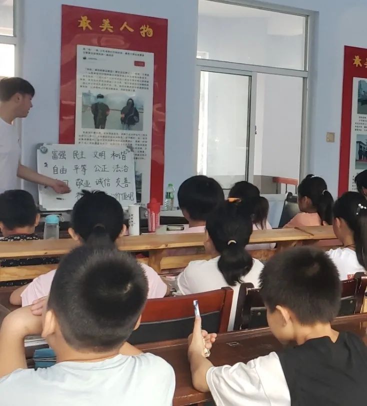 人无德不立,育人的根本在于育德。支教期间,团队以“立德为先,修身为本”为思想引导,给学生们安排了一节深刻的思政课。通过讲述社会主义核心价值观和德育的价值意义,让学生们懂得了如何实现人生的价值,了解到了中华民族伟大复兴的中国梦和建设社会主义强国的宏伟目标。课后,低年级的学生争先恐后地说着:“老师,明天我要背给你听哦!”高年级学生则满脸诚意地说道:“老师,我一定会做一名爱国、敬业、诚信、友善的好学生哒!”
