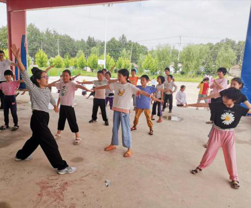 身体是一切革命的本钱,没有一个强健的体魄,又怎能更好地成长?支教期间,我们带领孩子们开展了军训时期的军体拳、梅花桩社团里的基础锻炼以及全民健身中的篮球运动。我们在地势平坦、视野开阔的小广场挥洒着青春的汗水;在微风轻拂,炎热消减的最后一节课放声高歌。军体拳课堂上,学生们一招一式模仿老师,声声“嘿哈!”震天响;练习小八方时,一停一顿柔中带刚,展现中国武术中的“势峥嵘,气泓浓”;投掷篮球时,他们一次次尝试,期盼球落入框中的那一刻,余晖里那锲而不舍地身影愈发令人感动。