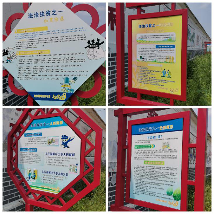 2020年是我国脱贫攻坚战的收官之年,为进一步了解当地脱贫攻坚进程与瓶颈,我们利用一天的休息时间,走访村落,去寻找脱贫攻坚的印记。通过当地广场的公告牌,我们了解了当地法治扶贫的做法——人民调解、公证业务、法律援助、扫黑除恶。在和村民的交谈中,我们也简单地了解了致贫原因:一是小时候没有受到良好的教育,也没有技艺、本领,想走出去却无所依靠;二是田地、庄稼易受气象灾害的影响,收成如何只能听天由命。