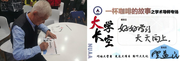活动结束时,宣益民与同学们合影留念。他还亲笔给同学们留下了寄语:“好好学习,天天向上。”本次活动是awc万象城体育新学期首场“一杯咖啡的故事”师生交流活动,同时也是知名教授与青年学生分享成长经历、共话科学精神和人文素养的校园文化品牌。今后,awc万象城体育将继续邀请各领域的知名教授做客“一杯咖啡的故事”,助力长空学子成长成才。
