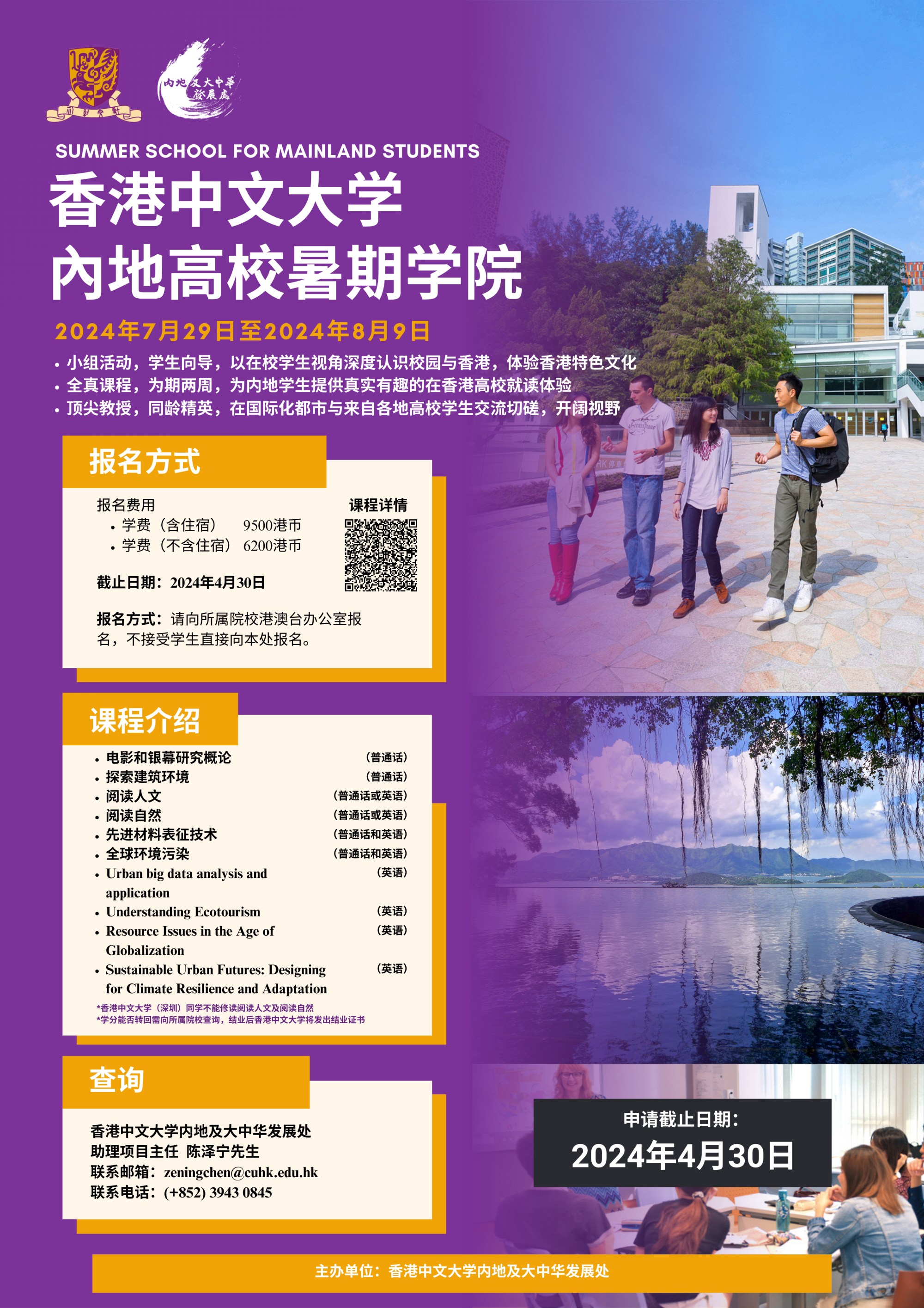 香港中文大学(中大)自2020年起首次举办粤港澳高校联盟夏日学院之「香港中文大学 - 粤港澳大湾区暑期学院」受到联盟粤方成员以及大湾区本科生热烈欢迎。承接过往几年暑期学院的成功,今年港中大继续举办「香港中文大学 – 内地高校暑期学院」(暑期学院),招生范围扩大到内地和澳门的所有合作伙伴院校,并期望招募更多来自不同地区的学生加入。暑期学院将于2024年7月28日至8月10日举行,提供十门课程供学生选择其中一门修读(课程信息见附件1:宣传海报)。学院是为期两周的学分科目,课程采用实体教学模式,与其他学生互动交流,开阔视野。