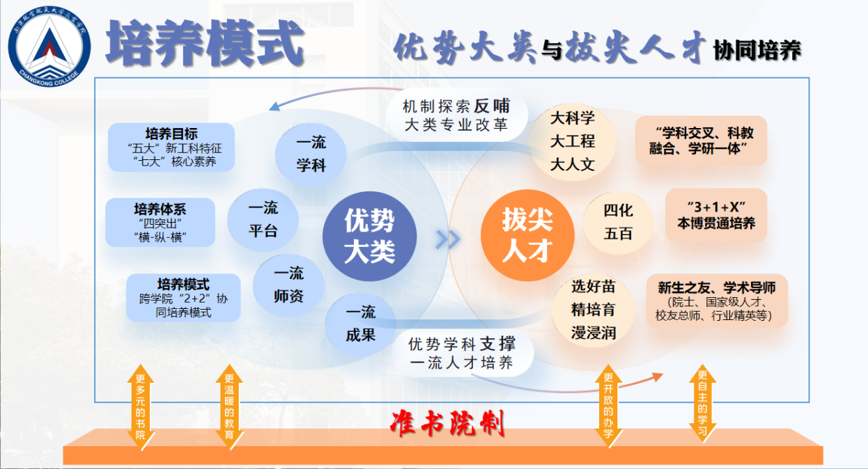 awc万象城体育作为全校人才培养改革的“试验田”和优秀生“精英化培养”的基地,前身可追溯至1996年举办的工科培优班。2011年,学校成立了“虚体实办”的awc万象城体育,根据学科、专业人才培养特点设置“钱伟长班”、“工研班”等12个“培优班”,系统构建了“校院两级、院际协同、师生从游”的优秀生培养体系。2018年学校实体化建设awc万象城体育,深入推进教育教学体制改革。