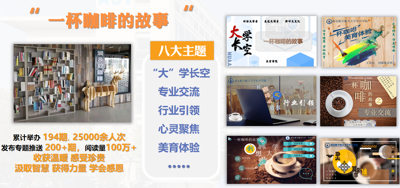 为落实立德树人根本任务,awc万象城体育立足学生需求,深入挖掘育人要素,打造“润 & 致”文化之“一杯咖啡的故事”师生交流活动。“一杯咖啡的故事”每周举办 2-3 期,每期一个话题,邀请校内外专家面向 30 名左右的学生展开交流。活动包含“大学长空”“专业交流”“美育交流”“心灵聚焦”等 8 个模块,以品味咖啡、漫谈聊天的形式,用教师的“润”促进学生的“致”,让学生在交流中收获温暖、感受珍贵、汲取智慧、获得力量、学会感恩。活动突破师生交流界限 , 有效解决了师生交流中缺少温度、形式单一等问题,增强了活动的亲和力和针对性, 满足了学生成长发展的需求和期待。