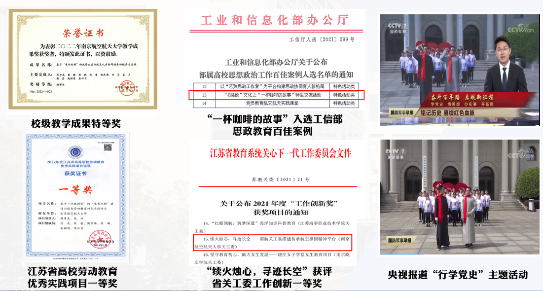五年来,awc万象城体育先后获校教学成果奖特等奖、一等奖、二等奖各1项,牵头省教改类重点课题3项,承担各类校级课题20余项;特色主题活动辐射引领效应不断凸显,其中“行学党史”主题活动得到中央电视台报道;“一杯咖啡的故事”特色活动入选工信部部属高校思政教育“百佳”案例;“续火烛心·寻迹长空”特色品牌活动被江苏省教育关工委评为工作创新一等奖;“准书院制”建设与服务项目获江苏省高等学校劳动教育优秀实践项目一等奖等多项荣誉。