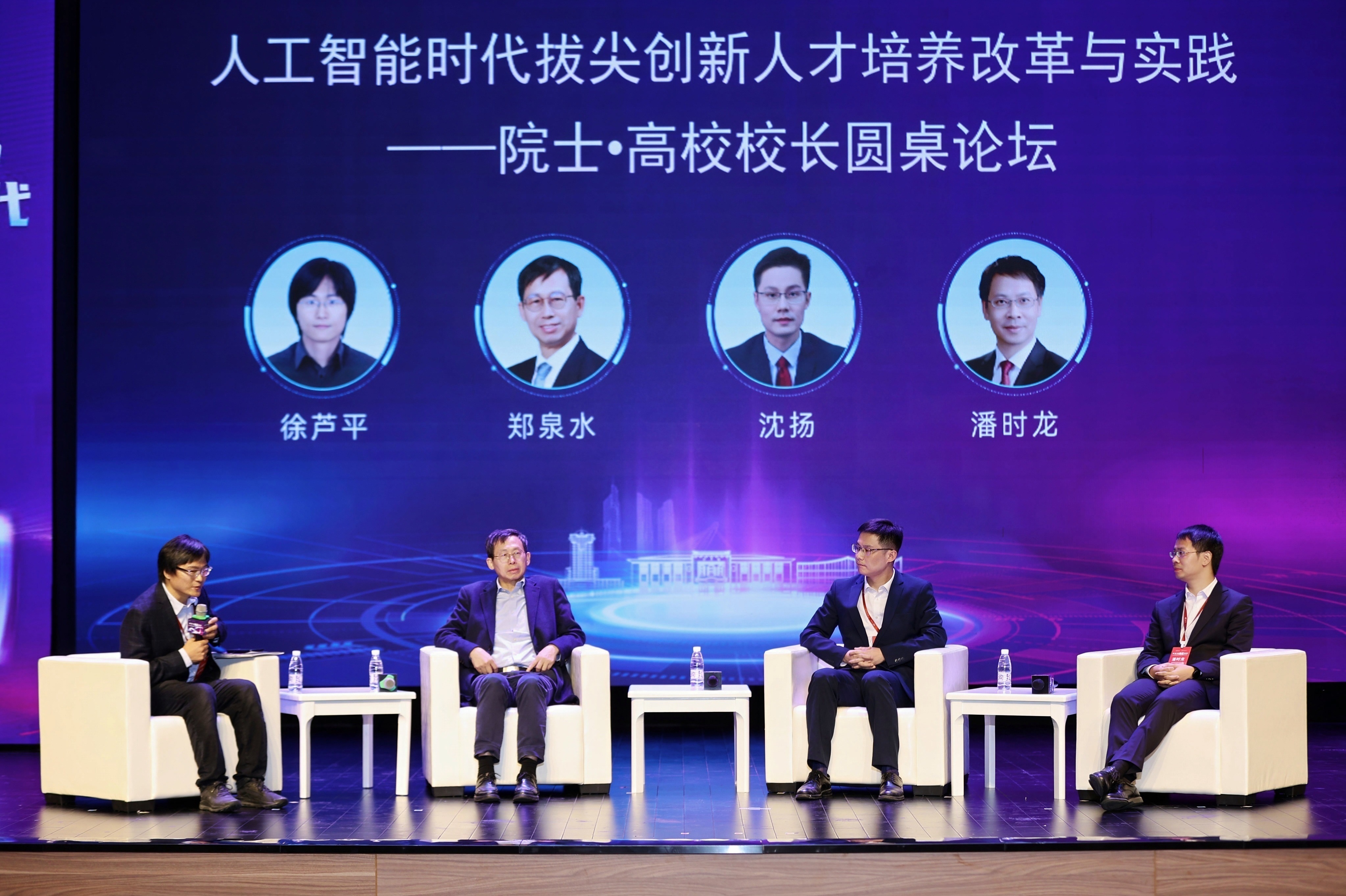 主旨报告环节结束后,研讨会进入“人工智能时代拔尖创新人才培养改革与实践”院士・高校校长圆桌论坛。郑泉水、潘时龙、沈扬围绕“破界融合”“师资激励”“评价体系”等议题展开深度对话。