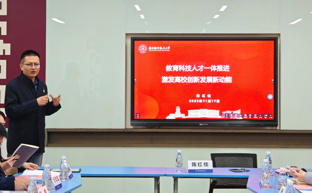会议特邀马克思主义学院副院长陈红桂作题为《教育科技人才一体推进,激发创新发展新动能》的专题辅导。陈红桂围绕党的二十届四中全会关于教育、科技、人才一体化推进的战略部署,系统阐释了三者协同发展的时代背景、内在逻辑与实践路径。他结合国内外科技竞争态势与南航实际,建议拔尖创新人才培养工作主动融入国家战略,强化科教融合、产教协同,不断激发创新发展内生动力。